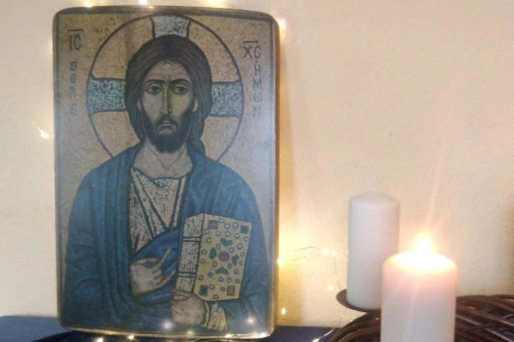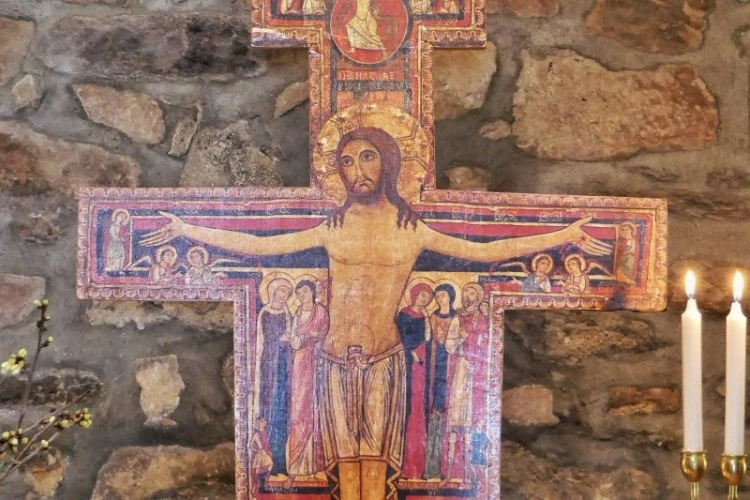Die Christus-Ikone, das Kreuz von San Damiano, hält uns beim gemeinsamen Beten Christus vor Augen. Jesus selbst schaut uns an und verbindet uns. Als Armenbibel gezeichnet zeigt die Ikone in vielen Bildern die gesamte Heilsgeschichte. Christus begegnet uns als der Auferstandene, der seine Hände weit ausstreckt: „Kommt her zu mir alle … Ihr gehört nicht der Arbeit, nicht den Menschen und nicht euch selbst. Ihr gehört mir. Eure Zeit steht in meinen Händen.“