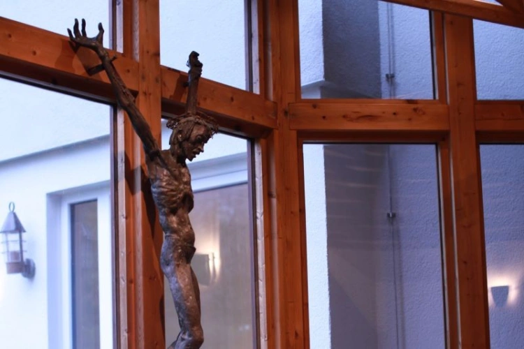 Der deutschlandweit bekannte Bildhauer Professor Kurt Grabert aus Göppingen hat den gekreuzigten Christus geschaffen. Er kam zu uns durch eine Begegnung mit Horst-Klaus Hofmann. Der Künstler hat ihn gefragt, ob wir in einer unserer Kapellen einen am Kreuz hängenden Jesus haben wollten, der ursprünglich in einer Kirche oder auf einem freien Platz aufgestellt werden sollte, dort allerdings nicht angenommen wurde.